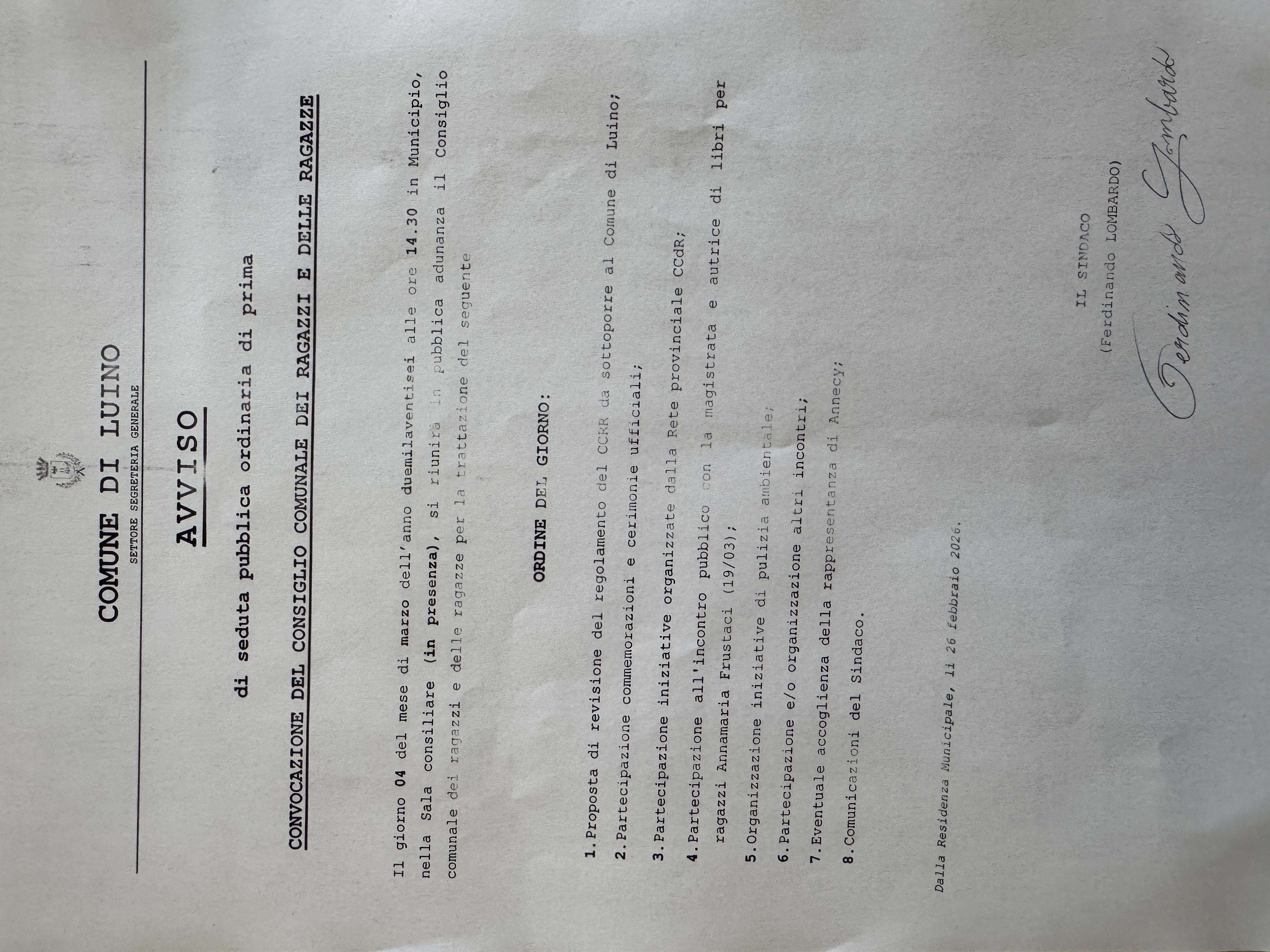 Si comunica che in data 04 marzo 2026 alle ore 14,30 è convocato il Consiglio Comunale dei ragazzi