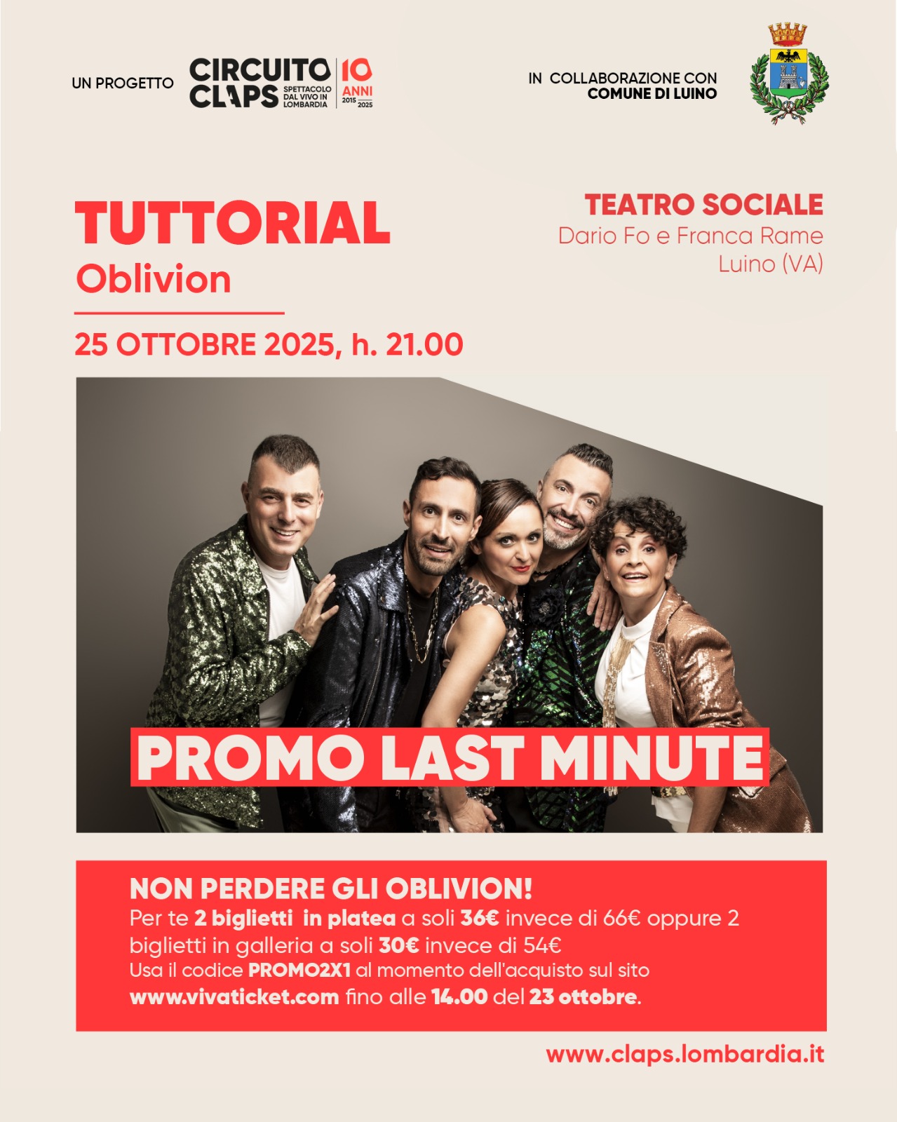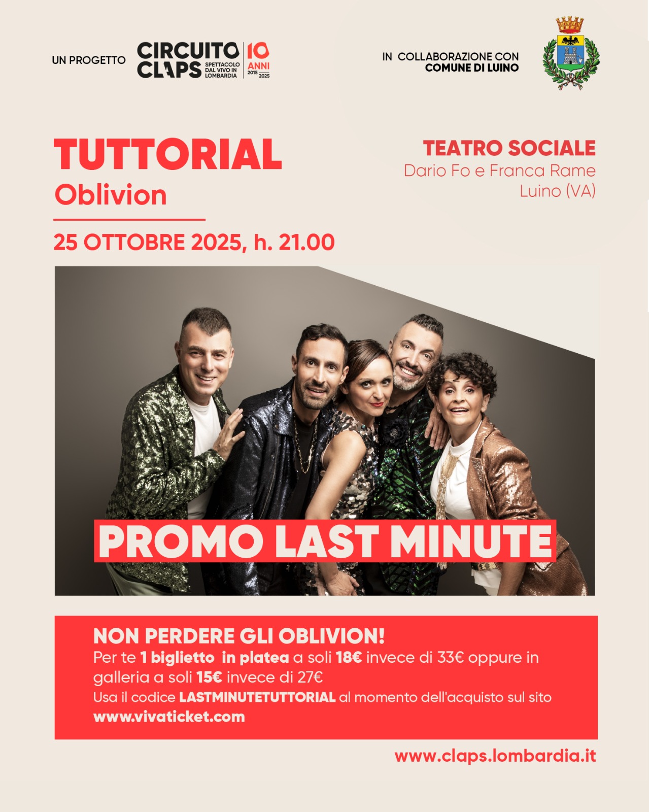 Gli iscritti alle associazioni del territorio possono usufruire di una promozione speciale, sia acquistando online https://www.vivaticket.com/it/ticket/tuttorial/271801 (inserendo il codice LASTMINUTETUTTORIAL), sia direttamente alla cassa a partire da un’ora prima dell’inizio dello spettacolo.